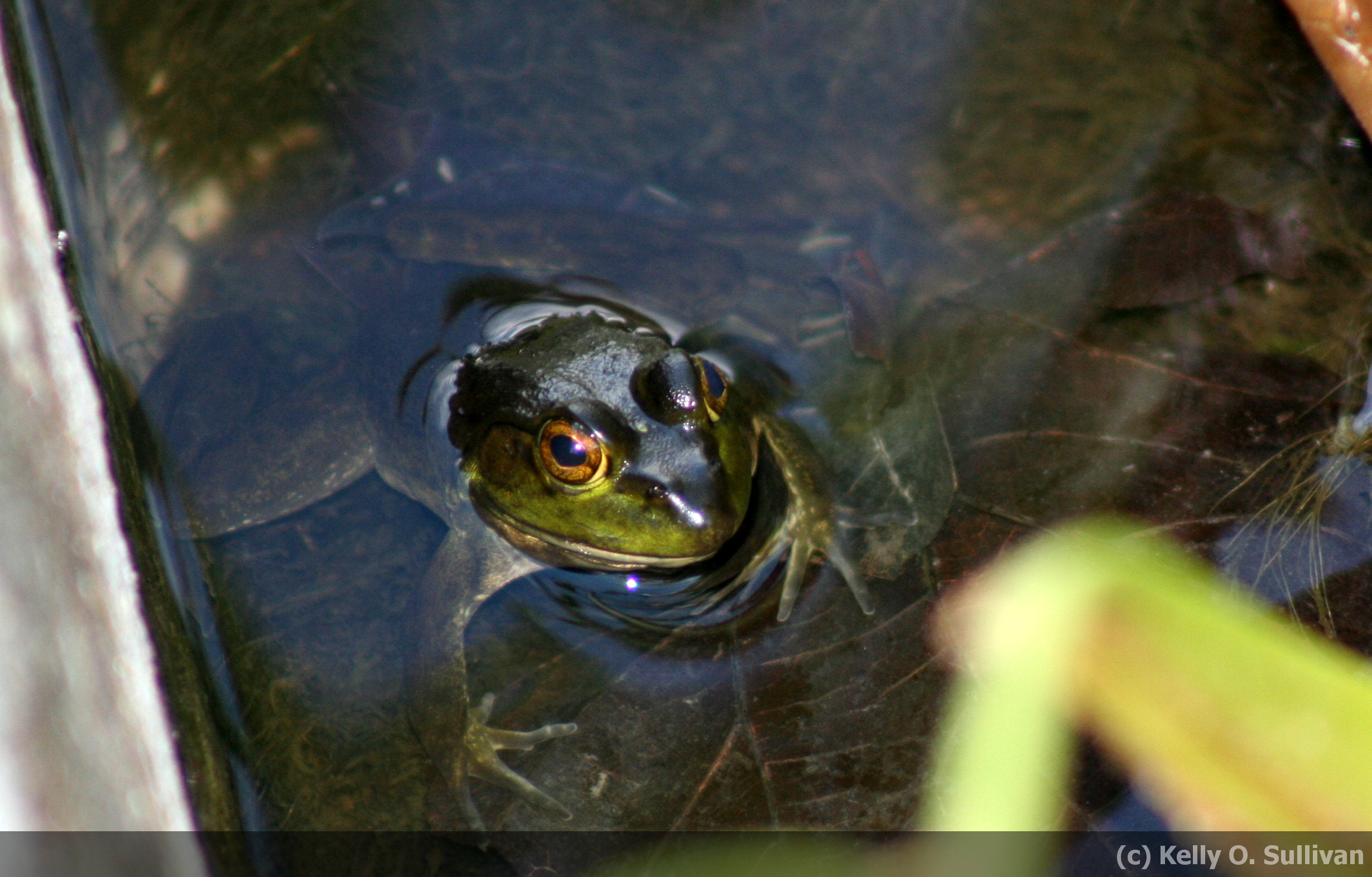 All this time I thought that Eyeballs was hiding – [UPDATE August 11, 2012 – Turns out this is NOT Eyeballs! This is a fourth frog newly named “Uptown Frog” – see the August 11 entry for more information]. However, it’s not like I thought! While Brave Frog and Cave Frog hang out mostly by the pond edge (or in the lilypads!) it appears Eyeballs is a bit more adventurous. I spotted him tucked between a plant and a boulder upstream of the bridge! He’s still skittish, but with patience and stealth I got a good photo of his cute little face.