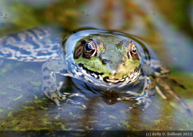 Yes indeed we do miss Brave Frog. He was the first we spotted and was the one most often out – plus he had such distinctive markings. I hope he is happy wherever he moved. This photo combines several of my favorite things – Brave Frog flattened out on a rock, frog with head just above water, and frog face-on. What a handsome devil!
