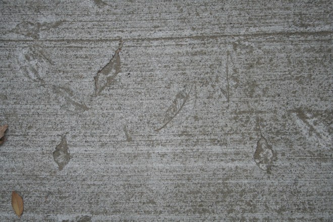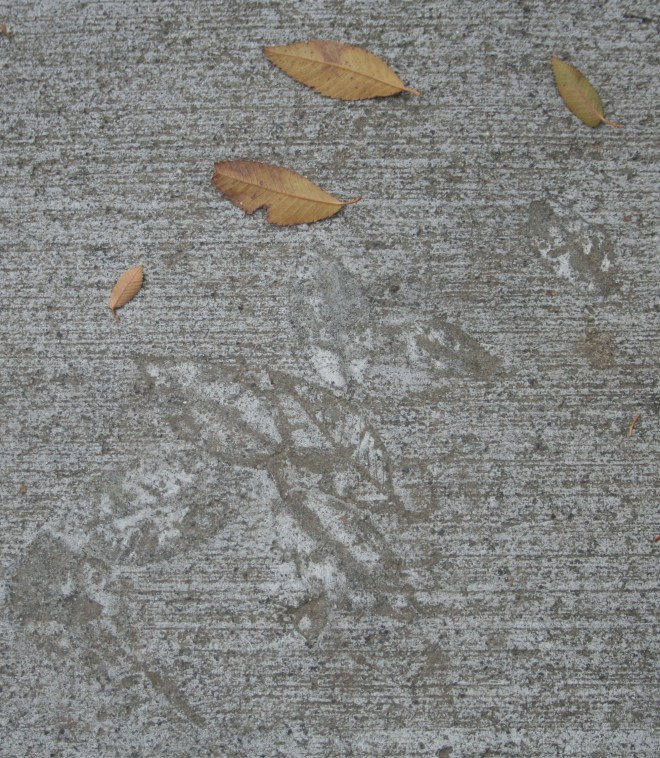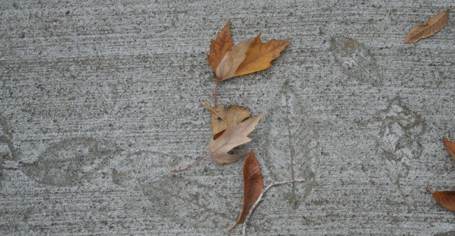 I take a lot of walks around my neighborhood. I’m very familiar with the sidewalks – and I have a personal favorite. I’m sure that sounds odd, but it’s true. Clearly this particular sidewalk concrete was poured in the autumn, and then a lot of leaves fell. Instead of erasing the evidence, the impressions are still there. Finally one day I took my camera with me so I could take photos of the fossil-leaves with the newly fallen leaves. I hope you enjoy them.