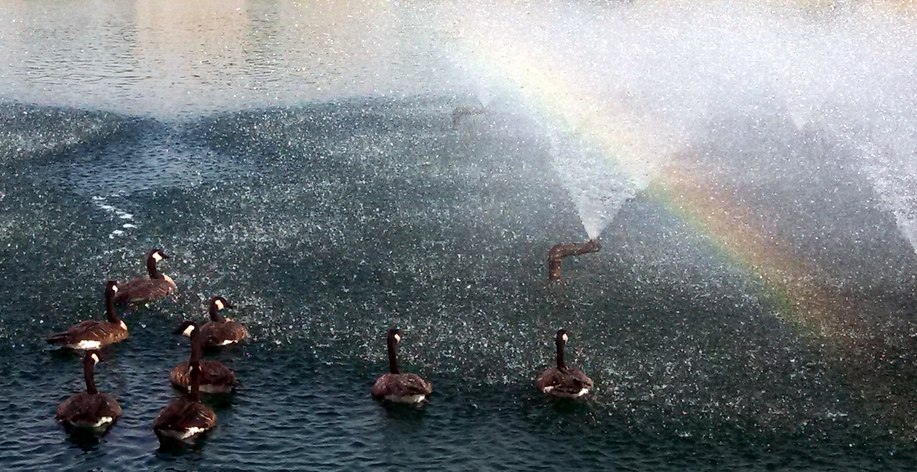 At work there is a large pond area with fountains that provides a heat-sink for the HVAC systems of nearby buildings. It also provides a waystation for a lot of geese. On this hot day, the geese were swimming under the fountains to stay cool (I presume) and we all enjoyed a rainbow together.