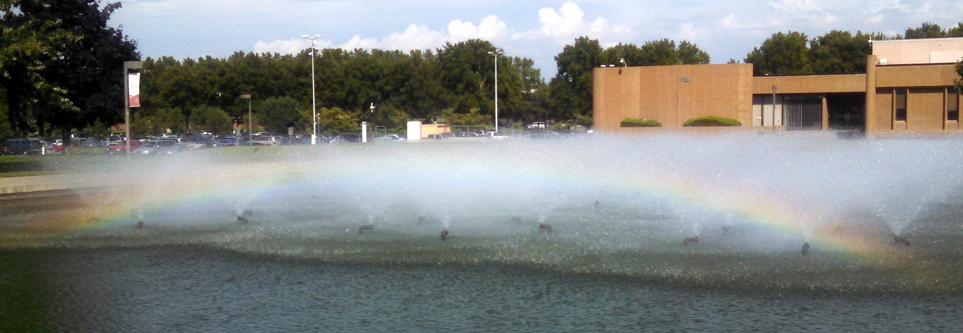 Scene while walking: August 25, 2014 I walk by these fountains at work a lot – and sometimes I see a fragment of a rainbow here. This is the first time I saw an entire arc! Share this: Click to share on X (Opens in new window) X Click to share on Facebook (Opens in new window) Facebook Click to share on Pinterest (Opens in new window) Pinterest Click to share on Tumblr (Opens in new window) Tumblr Like Loading... Related