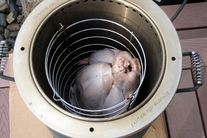 This has marinade basted on it that is very important – we use Wicker’s original and there is zero reason to look for anything else. It’s perfection. Close the lid, and now we’re smokin’!