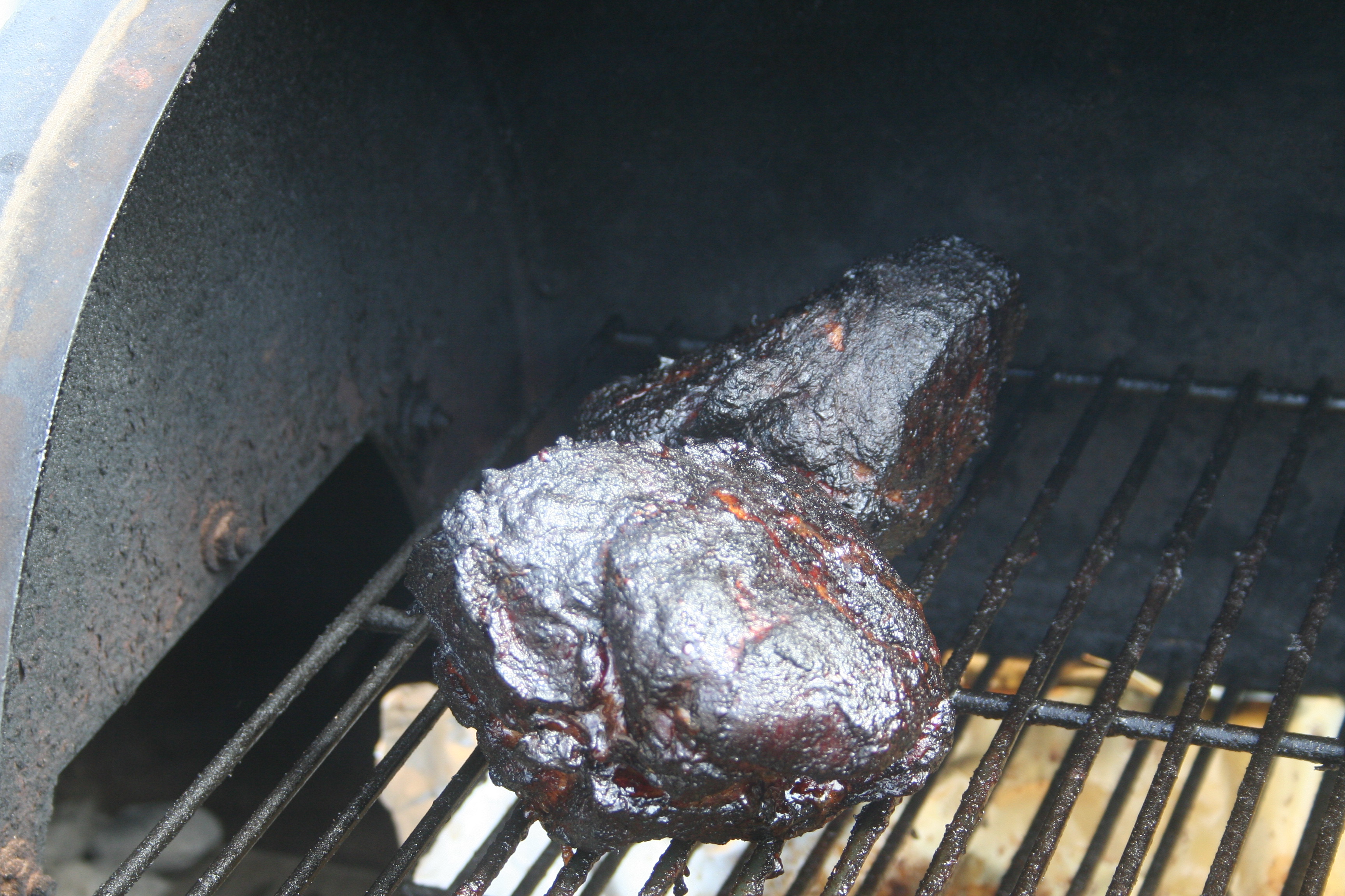 For the rest of the day I keep checking the smoke and the coals – every 15 minutes or so (maybe 30 at max) I need to add coals and/or wood chips. Now, there are people who will tell you that adding more wood chips after a certain time is meaningless because no more smoke will penetrate the meat. Perhaps they are right. There is no doubt a time that I add the wood chips solely to torture my neighbors with the fantastic aroma.