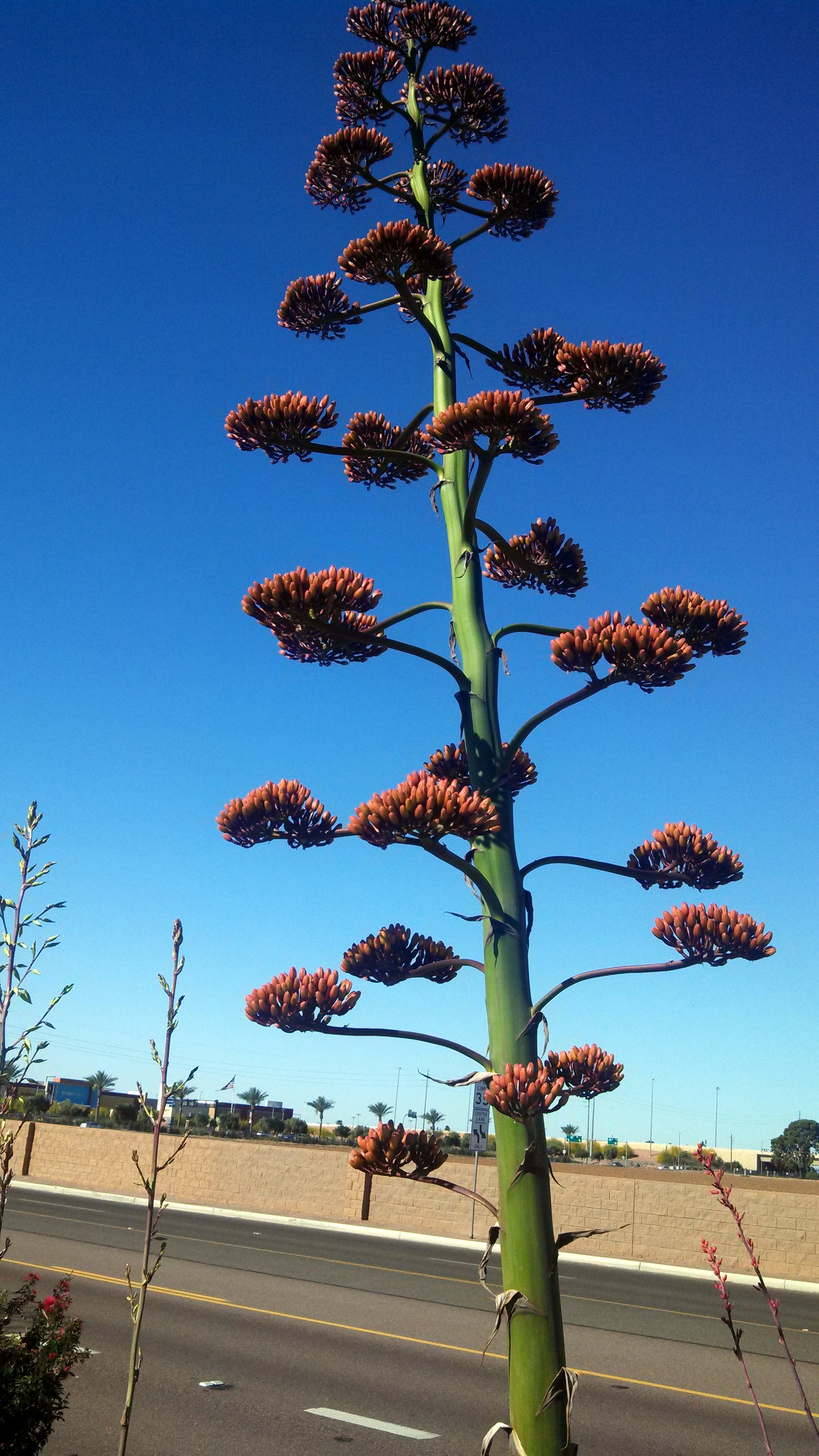 EDITED 8 April 2014: turns out this is a “century plant” (Agave americana) but they don’t take 100 years to bloom. They do take 10 or more years to bloom, and they only do it once – and then they die! So we were quite fortunate to have seen two at one time.