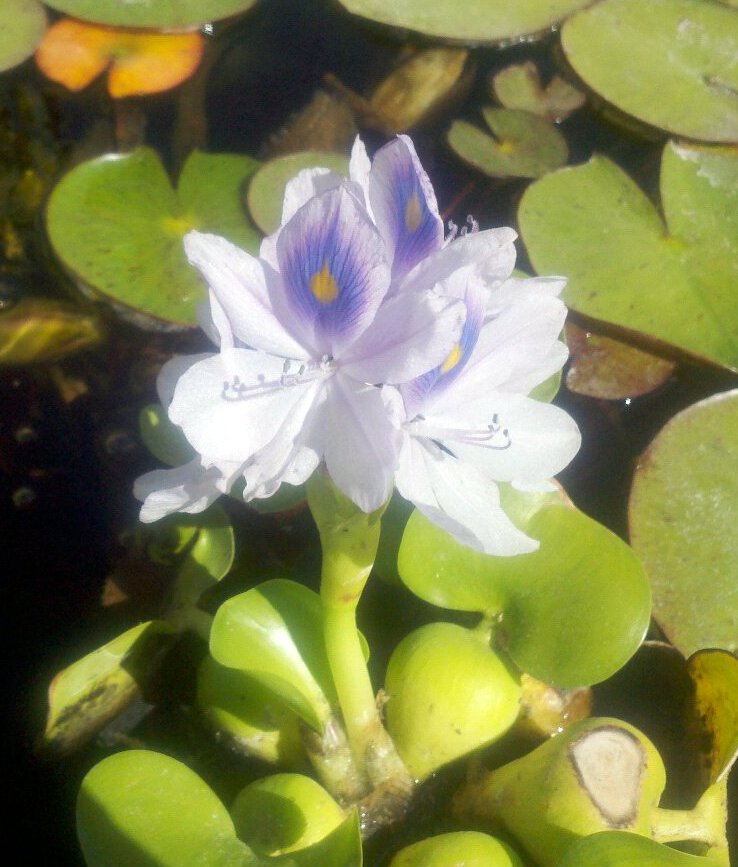 I am 99% certain my mother took this photo last summer. I know it wasn’t this summer because we didn’t put in water hyacinth this year. They are a lovely flower – but they bloom for about a day and that is it. Plus, they are annuals where I live. But I admit, the dragonflies did enjoy posing on top of them! Of course, this one isn’t in bloom. Below is a photo of one fully bloomed – which you have to have good timing to get since they only last a day. Apologies for the blur; I believe this was with my phone and the lens was probably not so clean. Or, you can assume I used a nice filter for this effect.