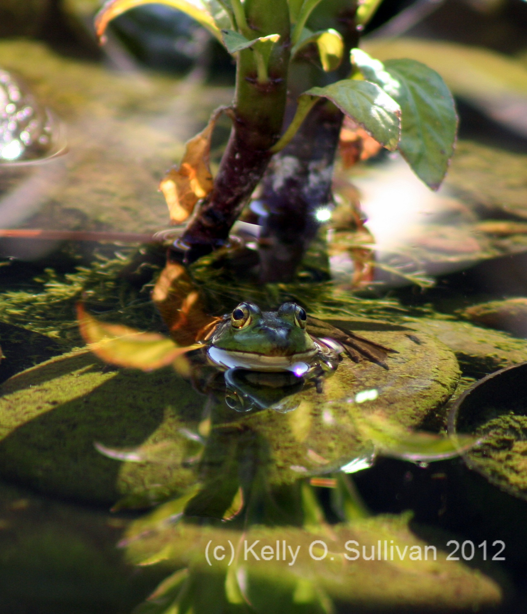 One morning there had been a lot of drama in the pond and the lily pads were all messed up. We have no idea whether it was a bird (herons around here) or a raccoon or something else, but something was definitely in the pond. Even better, we know they were unsatisfied because all fish and frogs were accounted for afterwards. Brave Frog took advantage of an overturned lily pad which of course made him stand out even more. I love the bubbles under his nose!