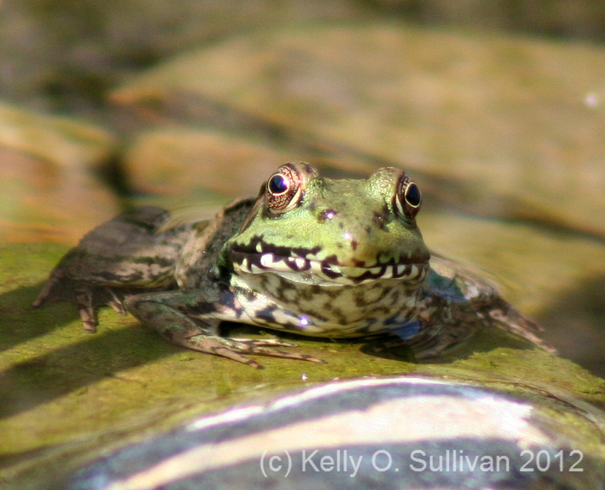 I can always count on Brave Frog to pose on a sunny rock for me! I am fascinated by the coloring – it’s not just the water making a difference. He is green at the head and brown at the back/legs. While this does help him blend into the algae-covered rocks (honestly, I do try to keep that from being too much of a problem) his bright green/black/white head also make him easy for me to spot, even without binoculars.