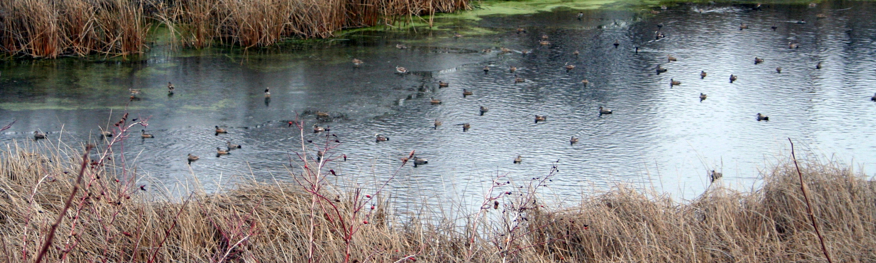 I get to see a lot of wildlife while I’m walking. There are some wetlands on a ranch that I walk near – the road is above the ranch so I’m looking down. The pond attracts a lot of ducks – in summer it’s covered in algae and in winter part or all of it freezes over.