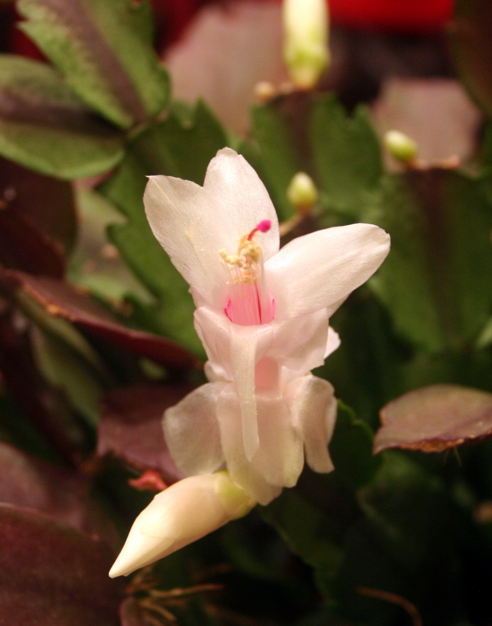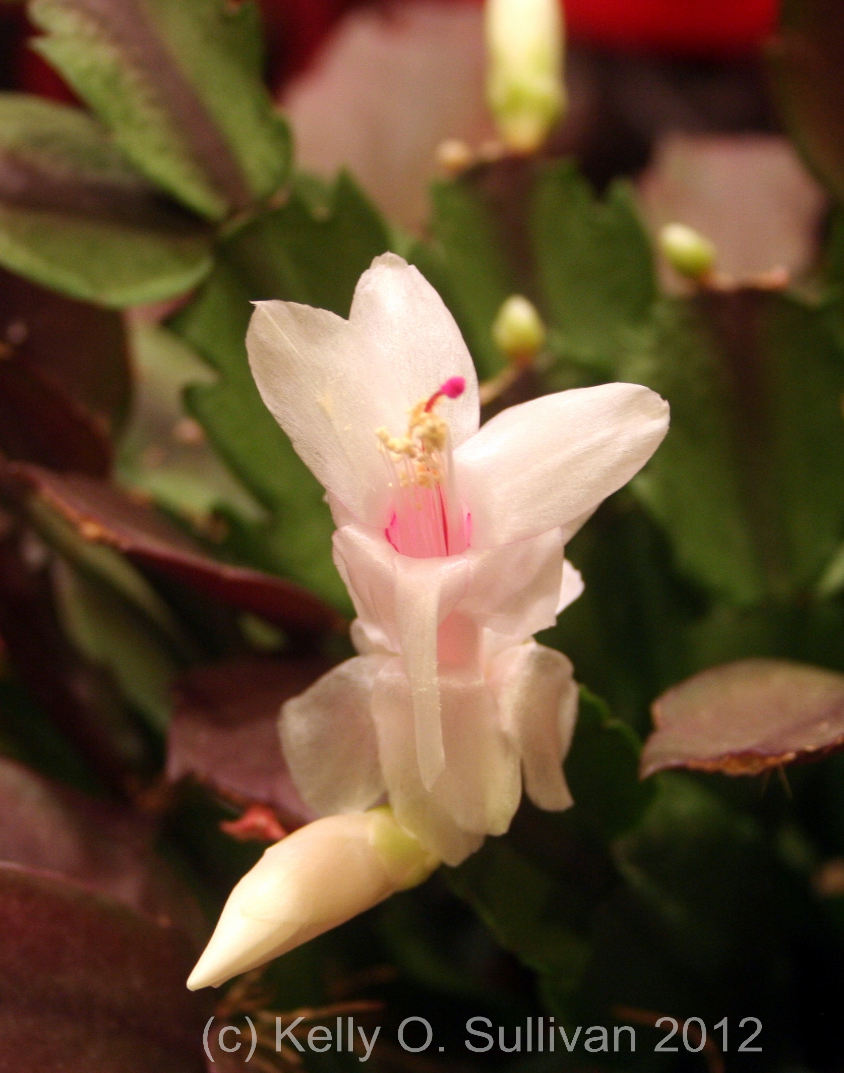 Last year my aunt gave my mother a “Christmas Cactus” – nearly every one I’ve seen had red blooms, but this one has white/pink blooms. Normally giving my mother a plant is a risky proposition, but she does well with the succulents and the cactus bloomed like crazy this year. It’s a very pretty accent in their kitchen.