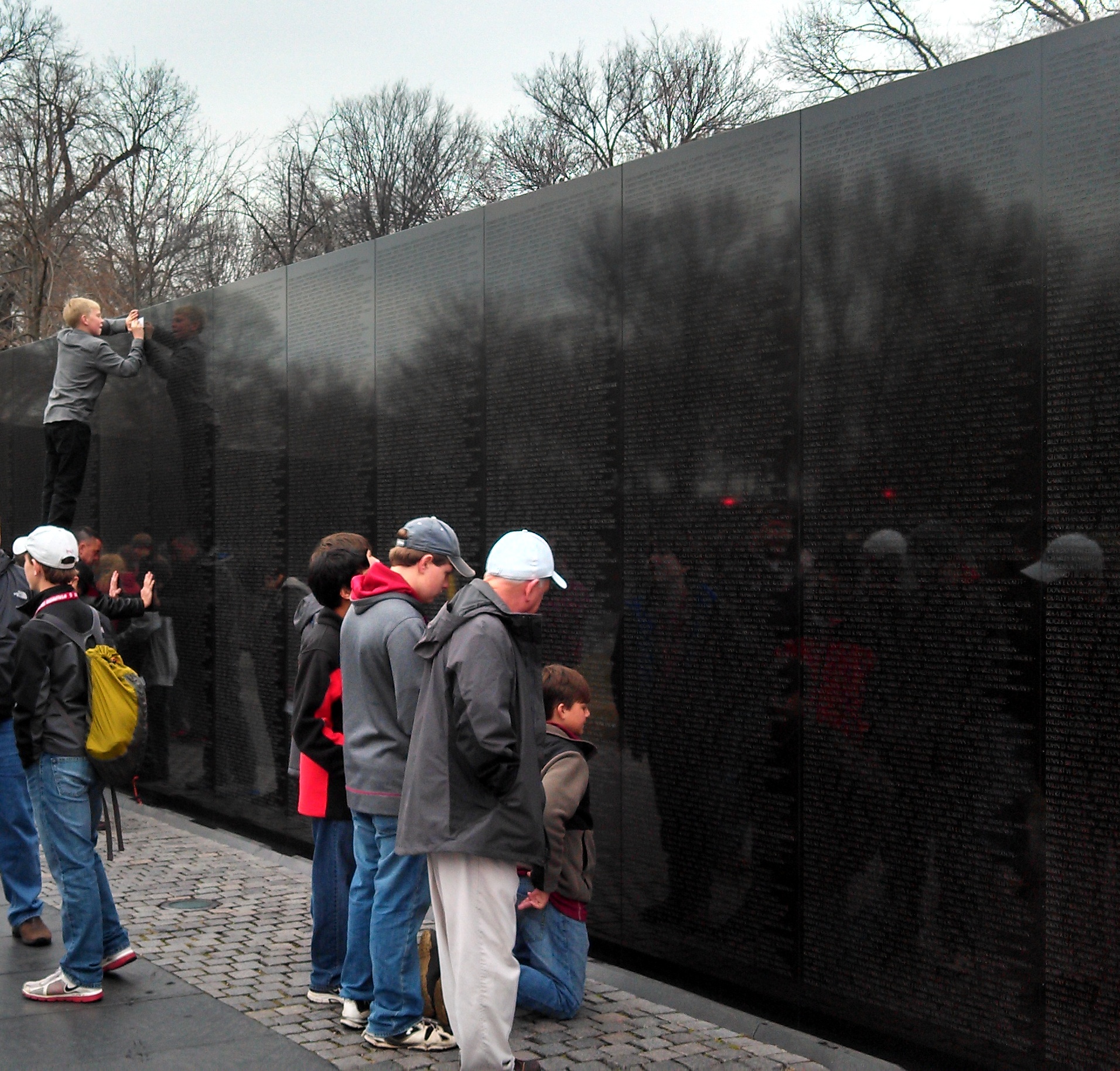 I had time recently to walk by many of the memorials in Washington, D.C. One of the most moving for me is the Vietnam Memorial – a wall of names memorializing lives cut far too short. On this day I saw a young boy standing on the shoulders of a man and making an etching of someone’s name. I have in my mind all three are related, and the name he was capturing is a man he never got to know.